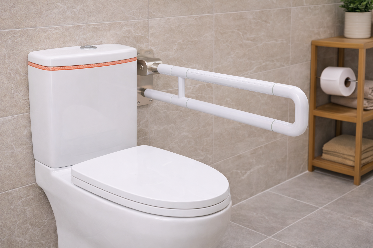 זרוע אחיזה מתרוממת 75 ס״מ מנירוסטה בציפוי ABS – פתרון בטיחות מתקדם לשירותים וחדרי רחצה