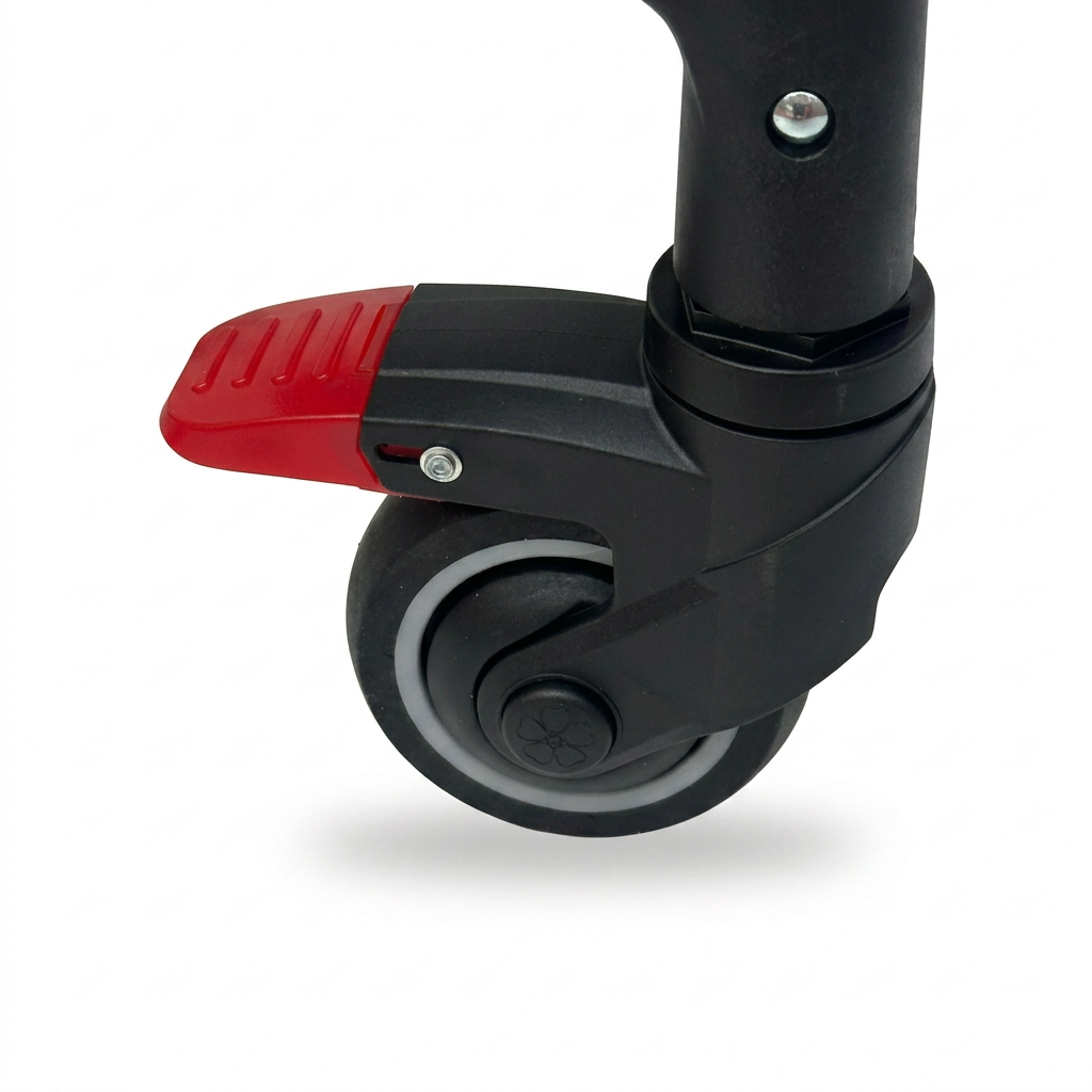 הגלגלים הם חלק אינטגרלי מהמבנה, אך נעילת הבלמים הופכת את הכיסא ליציב לחלוטין – בפועל הוא מתפקד כקומודה קבועה כשהבלמים נעולים.