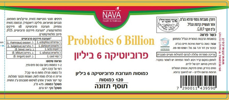 פרוביוטיקה בריכוז של 6 ביליון חיידקים בכל כמוסה, באריזה של 120 כמוסות, מהווה מוצר המתאים לשימוש יומיומי לתמיכה במערכת העיכול. המוצר כשר פרווה ובהשגחת הבד"ץ העדה החרדית.