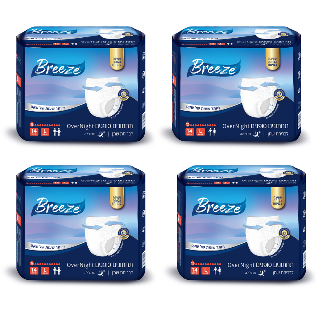 Breeze Over Night הינם תחתוני ספיגה לילה עם גזרה גבוהה, מיועדים לנשים וגברים המתמודדים עם בריחת שתן בדרגות בינונית עד כבדה. התכונות המתקדמות של המוצר מספקות נוחות מרבית והגנה במהלך הלילה.