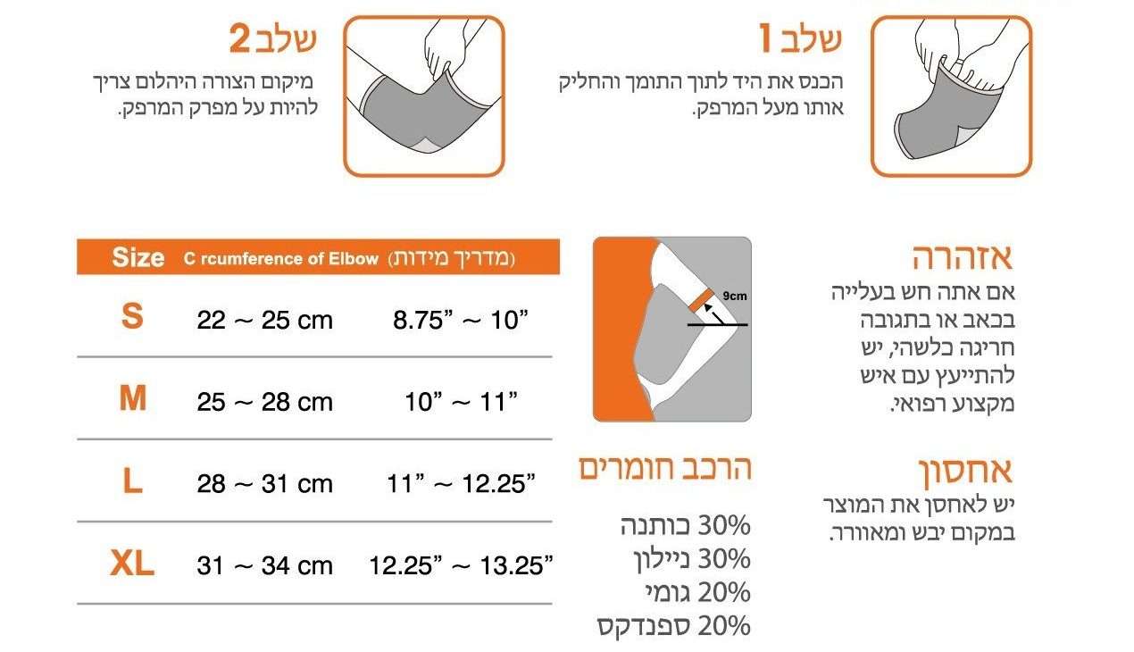 - ללבוש את המגן על המרפק כך שיכסה את האזור הנדרש מבלי להפעיל לחץ מוגזם.