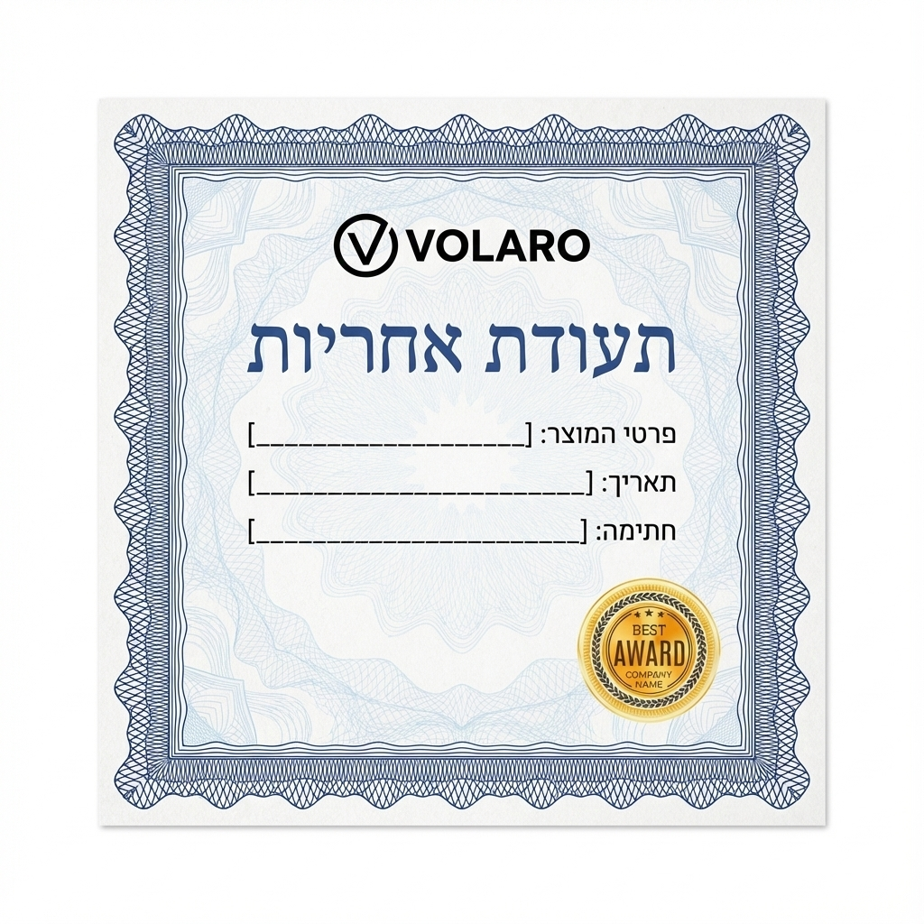 תנאי האחריות, היקפה, תקופתה, החרגותיה והזכויות מכוחה מוגדרים ומפורטים אך ורק במסמך “תעודת האחריות – VOLARO” כפי שנמסר עם המוצר ו/או כפי שמפורסם באתר החברה.